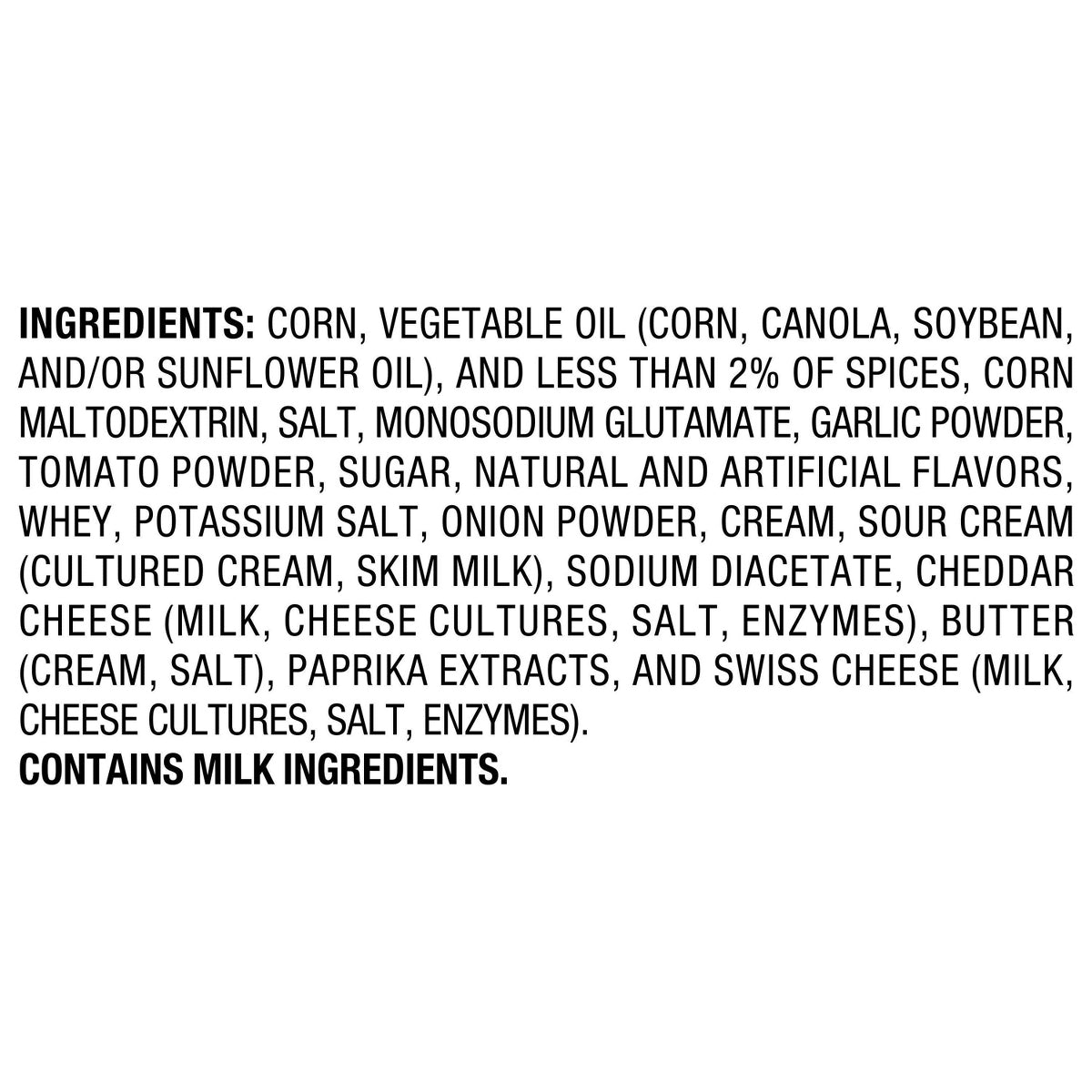Ingredients: Corn, Vegetable Oil (Corn, Canola, Soybean, And/Or Sunflower Oil), And Less Than 2% Of Spices, Corn Maltodextrin, Salt, Monosodium Glutamate, Garlic Powder, Tomato Powder, Sugar, Natural And Artificial Flavors, Whey, Potassium Salt, Onion Powder, Cream, Sour Cream (Cultured Cream, Skim Milk), Sodium Diacetate, Cheddar Cheese (Milk, Cheese Cultures, Salt, Enzymes), Butter (Cream, Salt), Paprika Extracts, And Swiss Cheese (Milk, Cheese Cultures, Salt, Enzymes). CONTAINS MILK INGREDIENTS.