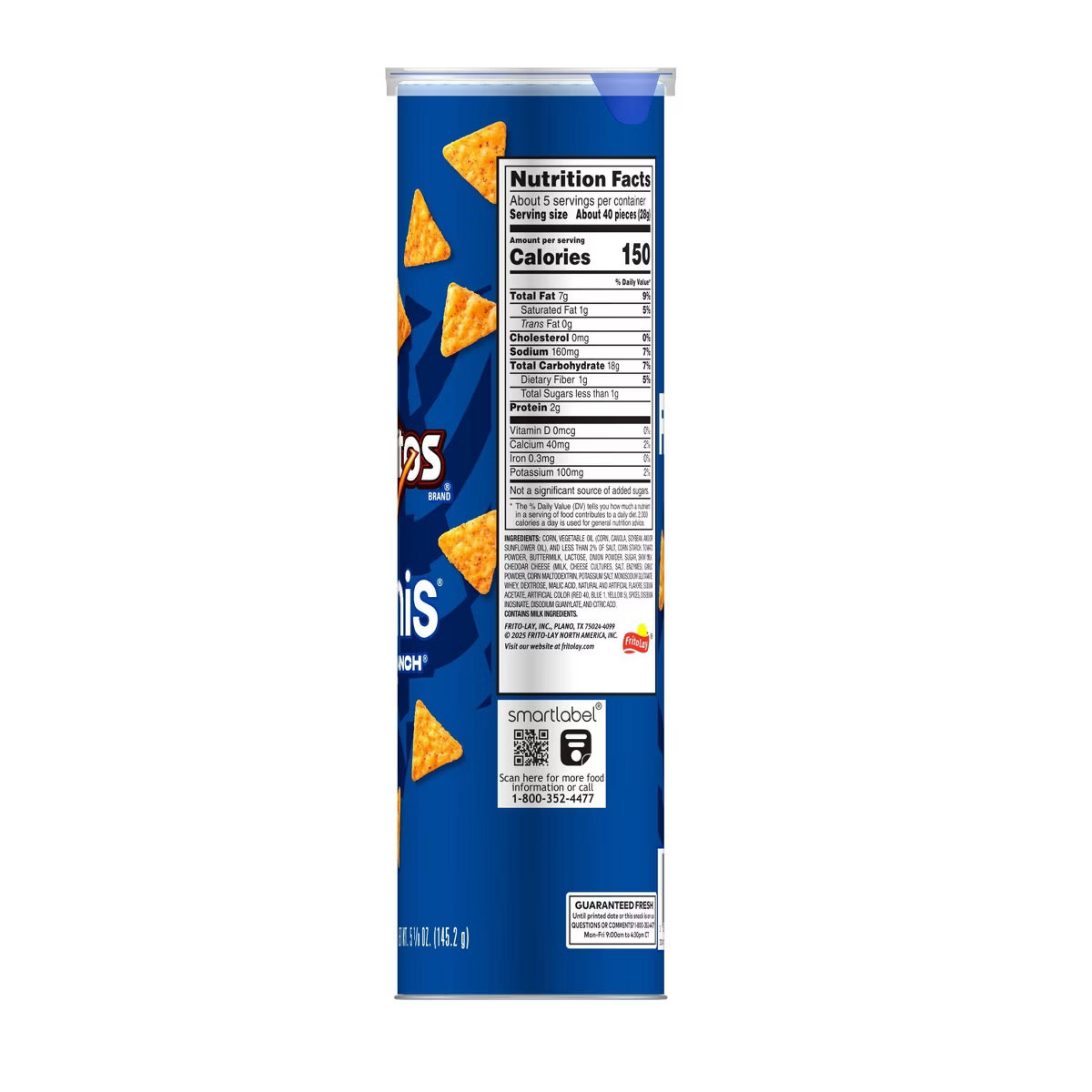 Ingredients: Corn, Vegetable Oil (Corn, Canola, Soybean, and/or Sunflower Oil), and Less than 2% of Salt, Corn Starch, Tomato Powder, Buttermilk, Lactose, Onion Powder, Sugar, Skim Milk, Cheddar Cheese (Milk, Cheese Cultures, Salt, Enzymes), Garlic Powder, Corn Maltodextrin, Potassium Salt, Monosodium Glutamate, Whey, Dextrose, Malic Acid, Natural and Artificial Flavors, Sodium Acetate, Artificial Color (Red 40, Blue 1, Yellow 5), Spices, Disodium Inosinate, Disodium Guanylate, and Citric Acid.