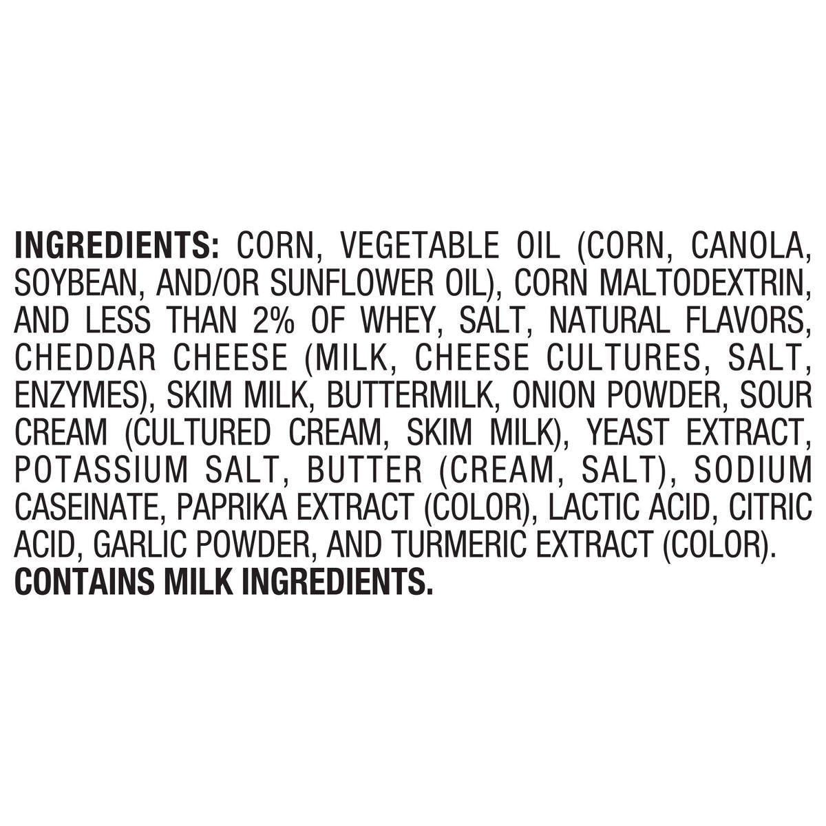 Ingredients: Corn, Vegetable Oil (Corn, Canola, Soybean, and/or Sunflower Oil), Corn Maltodextrin, and Less than 2% of Whey, Salt, Natural Flavors, Cheddar Cheese (Milk, Cheese Cultures, Salt, Enzymes), Skim Milk, Buttermilk, Onion Powder, Sour Cream (Cultured Cream, Skim Milk), Yeast Extract, Potassium Salt, Butter (Cream, Salt), Sodium Caseinate, Paprika Extract (Color), Lactic Acid, Citric Acid, Garlic Powder, and Turmeric Extract (Color).