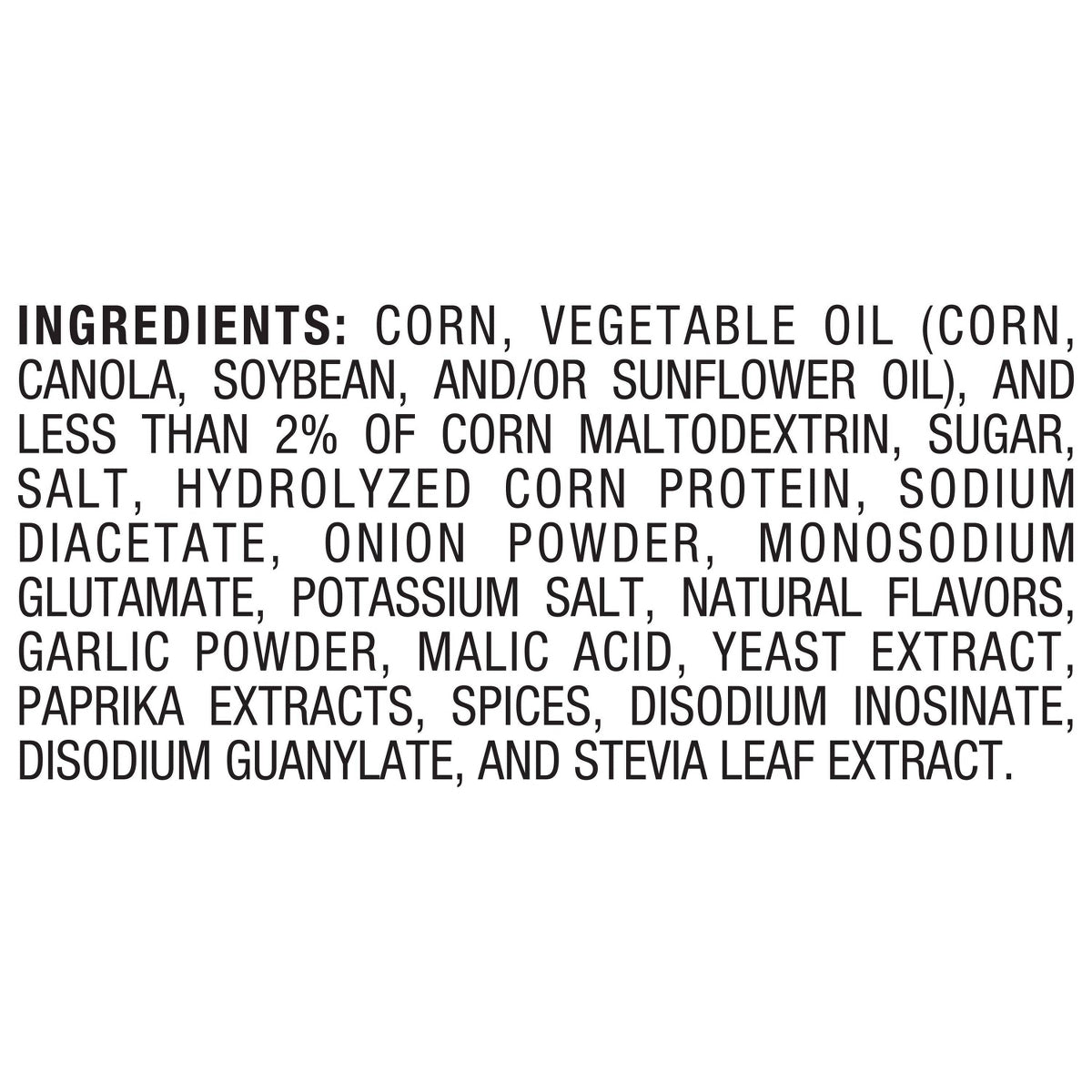 Ingredients: Corn, Vegetable Oil (Corn, Canola, Soybean, and/or Sunflower Oil), and Less than 2% of Corn Maltodextrin, Sugar, Salt, Hydrolyzed Corn Protein, Sodium Diacetate, Onion Powder, Monosodium Glutamate, Potassium Salt, Natural Flavors, Garlic Powder, Malic Acid, Yeast Extract, Paprika Extracts, Spices, Disodium Inosinate, Disodium Guanylate, and Stevia Leaf Extract.