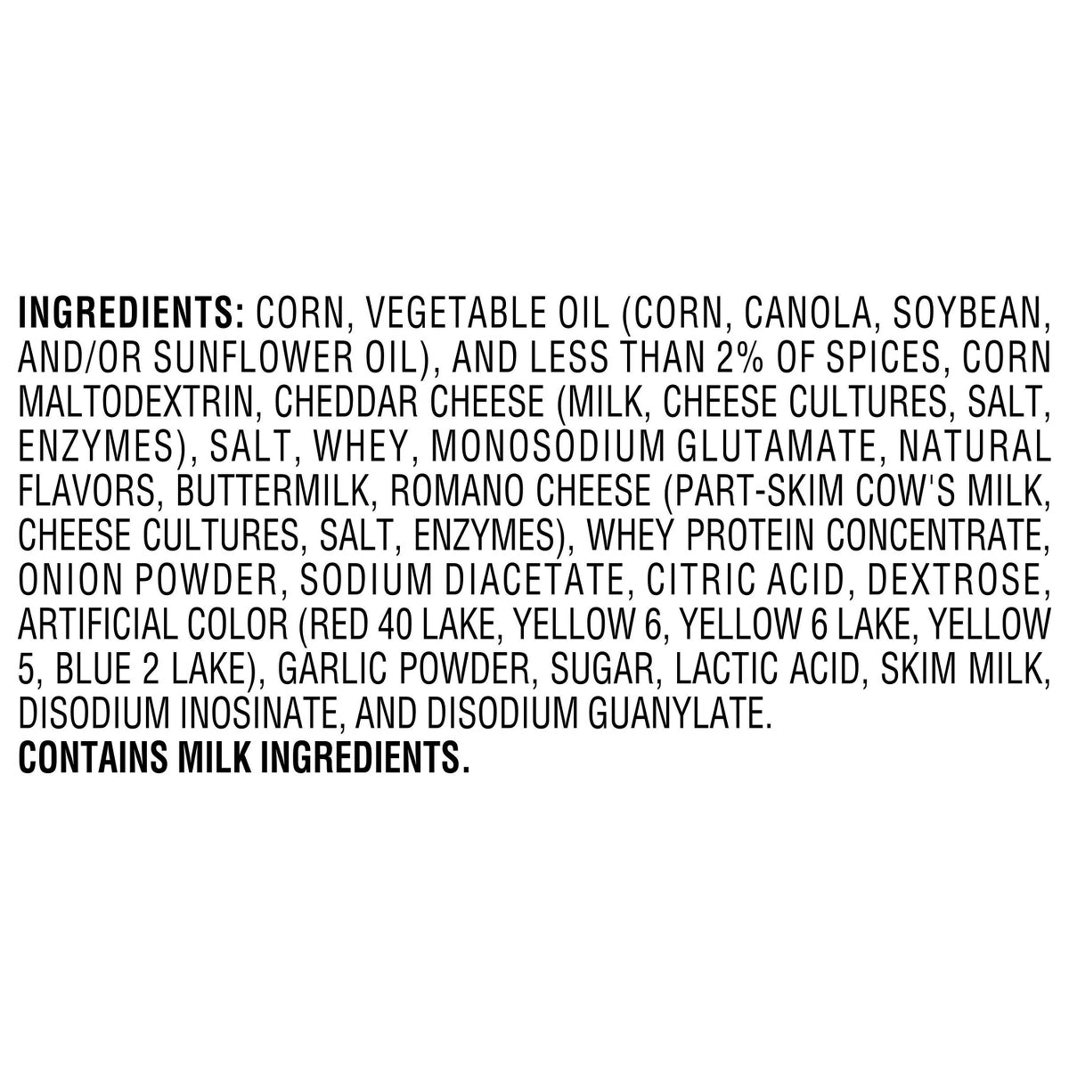 Ingredients: Corn, Vegetable Oil (Corn, Canola, Soybean, And/Or Sunflower Oil), And Less Than 2% Of Spices, Corn Maltodextrin, Cheddar Cheese (Milk, Cheese Cultures, Salt, Enzymes), Salt, Whey, Monosodium Glutamate, Natural Flavors, Buttermilk, Romano Cheese (Part-Skim Cow's Milk, Cheese Cultures, Salt, Enzymes), Whey Protein Concentrate, Onion Powder, Sodium Diacetate, Citric Acid, Dextrose, Artificial Color (Red 40 Lake, Yellow 6, Yellow 6 Lake, Yellow 5, Blue 2 Lake), Garlic Powder, Sugar, Lactic Acid, Skim Milk, Disodium Inosinate, And Disodium Guanylate. CONTAINS MILK INGREDIENTS.