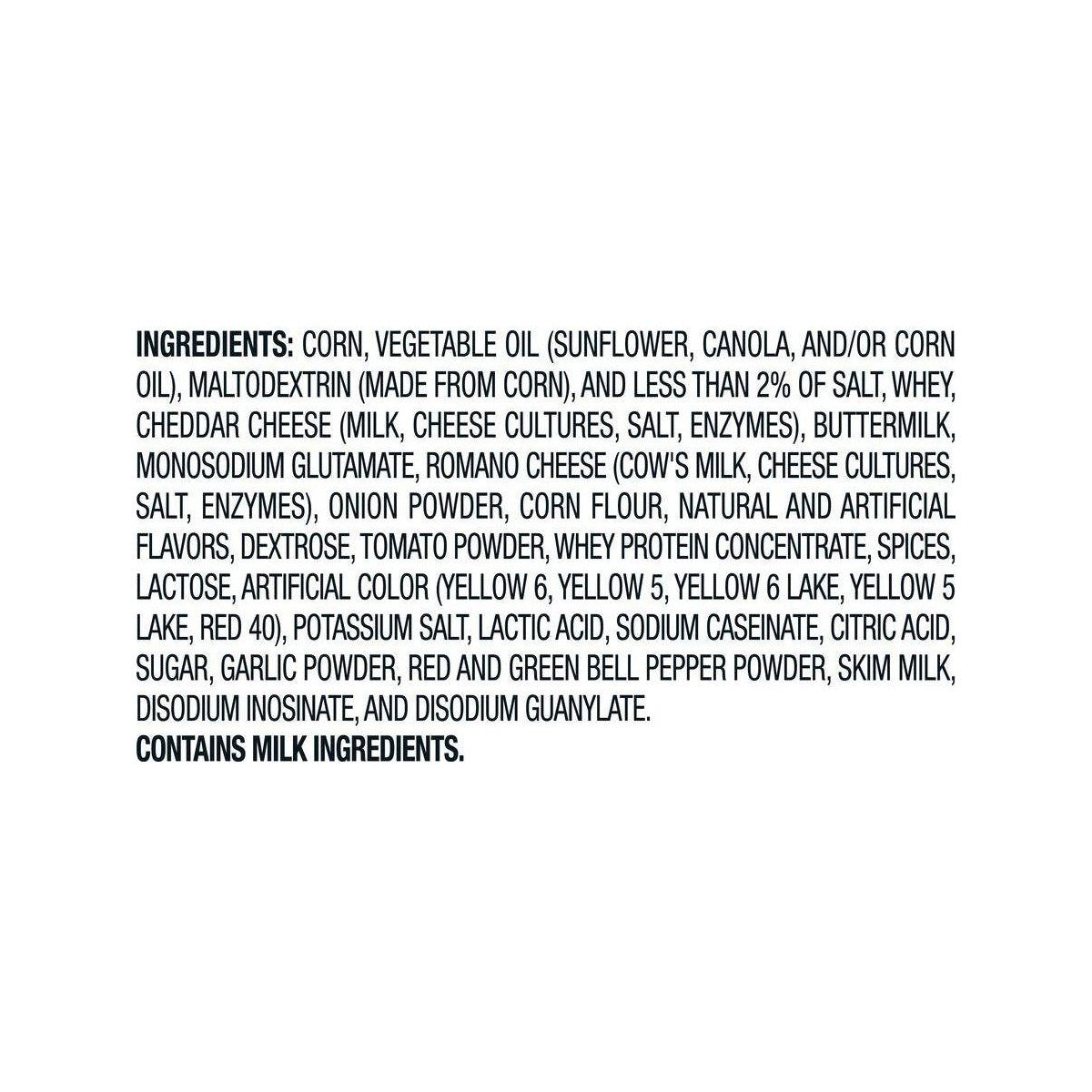 Ingredients: Corn, Vegetable Oil (Corn, Canola, Soybean, And/Or Sunflower Oil), Corn Maltodextrin, And Less Than 2% Of Cheddar Cheese (Milk, Cheese Cultures, Salt, Enzymes), Salt, Whey, Monosodium Glutamate, Buttermilk, Romano Cheese (Milk, Cheese Cultures, Salt, Enzymes), Whey Protein Concentrate, Onion Powder, Potassium Salt, Corn Flour, Natural And Artificial Flavors, Dextrose, Tomato Powder, Lactose, Spices, Artificial Color (Yellow 6, Yellow 5, Red 40), Lactic Acid, Citric Acid, Sugar, Garlic Powder, Skim Milk, Red And Green Bell Peppers, Disodium Inosinate, And Disodium Guanylate. CONTAINS MILK INGREDIENTS.